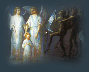 "Here I dared to ask my angel leaders: 'Tell me how can these terrible rulers of the air know in such detail all the evil deeds of men, and not only the open ones but even those that are secret?' The angels replied: 'Every Christian, as soon as he is baptized, receives from God an appointed guardian angel who guards him invisibly and inspires him night and day to every kind of good deed; he also records all his good deeds, for which that man later can hope to receive from the Lord grace and eternal recompense in the Heavenly Kingdom. The prince of darkness, who desires to draw into his own destruction the whole race of men as well, also appoints one of his evil spirits to walk in the man's steps and record all his evil deeds. It is his duty to inspire man to such deeds by any vile trickery in his power; and when he succeeds in his designs, he records all the wickedness of which the man has made himself guilty. Such an evil spirit spreads the report of every man's sins to all the stations of torment, and this is how the sins become known to the princes of the air. When the soul parts from its body and desires to go to its Creator in heaven, the evil spirits prevent the soul and show to it its sins. If the soul has done more good deeds than evil, they cannot keep it; but if the sins outweigh the good deeds, they keep the soul for some time, shut it up in the prison where it cannot know God, and torment it as much as God's power allows them, until that soul, by means of prayers of the Church and good deeds done for its sake by those who are still on earth, should be granted forgiveness.