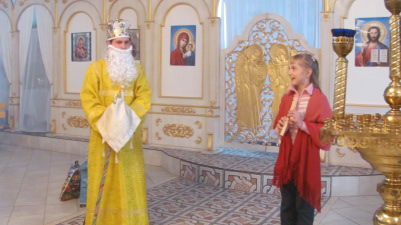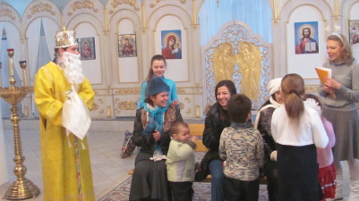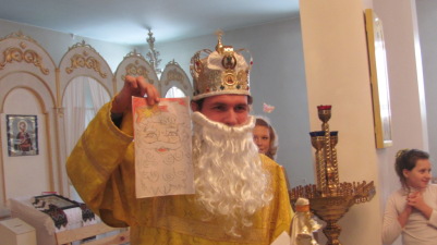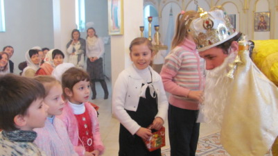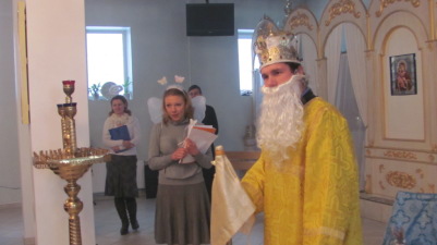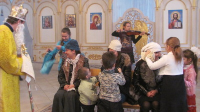 After the solemn divine service, Saint Nicholas himself and the fair-winged angels visited children, who had come to the temple with their parents. Children were reciting poems and proved they knew how to do good deeds. Violin and flute melodies and also cheerful child's laugh filled the temple. The adults were participating in fascinating games together with children with great pleasure.